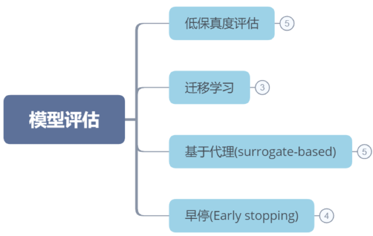 模型结构设计好后我们需要对模型进行评估,最简单的方法是将模型训练至收敛,然后根据其在验证集上的结果判断其好坏。但是这种方法需要大量时间和计算资源。因此有不少加速模型评估过程的算法被提出,总结如下: