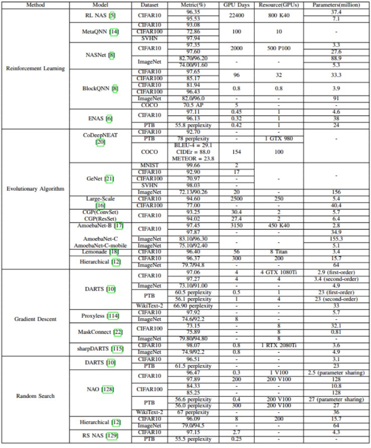 下图总结了不同NAS算法在CIFAR10上的搜索网络所花费的时间以及准确率。可以看到相比于基于强化学习和进化算法的方法,基于梯度下降和随机搜索的方法能够使用更少的时间搜索得到表现优异的网络模型。