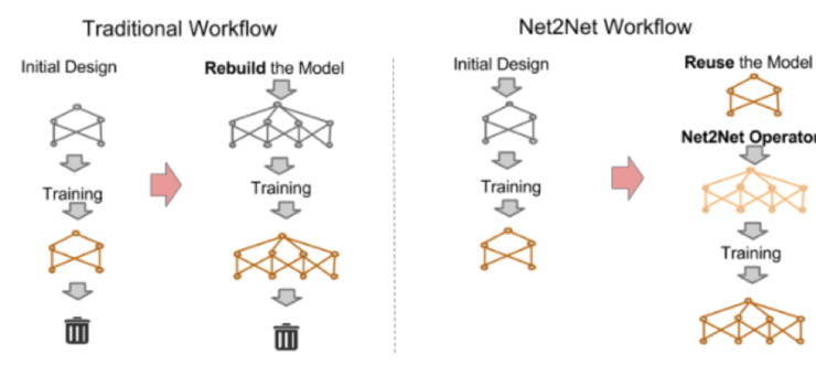 一般的网络设计方法是首先设计出一个网络结构,然后训练它并在验证集上查看它的性能表现,如果表现较差,则重新设计一个网络。可以很明显地发现这种设计方法会做很多无用功,因此耗费大量时间。而基于网络态射结构方法能够在原有的网络结构基础上做修改,所以其在很大程度上能保留原网络的优点,而且其特殊的变换方式能够保证新的网络结构还原成原网络,也就是说它的表现至少不会差于原网络。