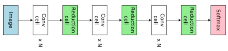 为解决整体结构网络搜索存在的问题提出了基于单元结构设计的方法。如下图所示,搜索到单元结构后需要叠加若干个单元结构便可得到最终的网络结构。不难发现,搜索空间从整个网络缩减到了更小的单元结构,而且我们可以通过增减单元结构的数量来改变网络结构。但是这种方法同样存在一个很明显的问题,即单元结构的数量和连接方式不确定,现如今的方法大都是依靠人类经验设定。