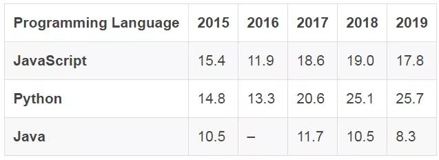 下面提供的两个表格总结了过去五年(2015-2019)里编程语言的流行趋势。该数据来自 2015-2019 年的 Stackoverflow 人气调查。