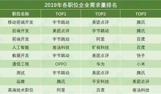上面这份图表对现在的求职者参考意义很大,几乎囊括了所有职位类别。字节跳动、美团对后端开发、移动前端开发、数据开发等岗位需求量很大。商汤科技对AI岗需求旺盛,有相关求职意向的朋友可以参考这张表进行针对性投递。