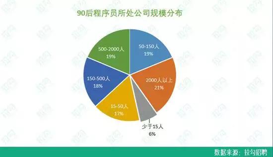 从不同规模公司分布情况上看,90后程序员大多分布在500人以下的中小规模公司,互联网大厂虽好但难进,只有21%的90后在2000人以上的大公司工作。