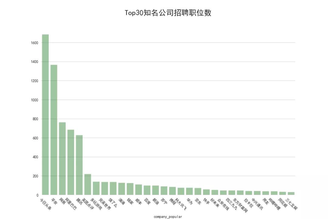 招聘职位数量排名 Top 30 的公司分布如下。随着今日头条在搜索、游戏、教育等不同领域的深入,其招聘职位数量本月大幅度领先。除此之外,招聘职位数的 Top 5 分别有平安、网易、阿里巴巴、腾讯。