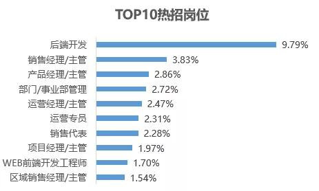 2019年上半年Top10热招职位中,后端开发需求最旺盛。销售类岗位占据三席,无论是在行业寒冬还是行业快速发展期,销售是最能直接给企业带来效益的岗位,成为各大企业招聘的重要岗位。