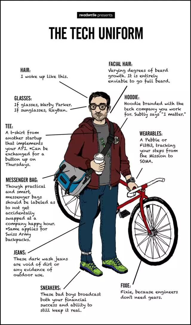 曾有自媒体人总结硅谷程序员的日常穿搭标配,感觉这应该适用于全球的程序员吧。