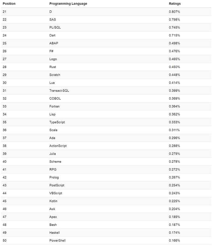 - 曾经一度被热捧的 Kotlin 现在发展趋势较为平稳,不过离排行榜的 Top 20 还有很大的差距,当前位于第 45 名。