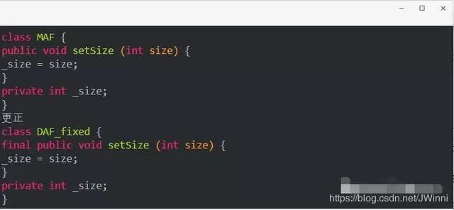 如:让访问实例内变量的getter/setter方法变成”final:简单的getter/setter方法应该被置成final,这会告诉编译器,这个方法不会被重载,所以,可以变成”inlined”,例子: