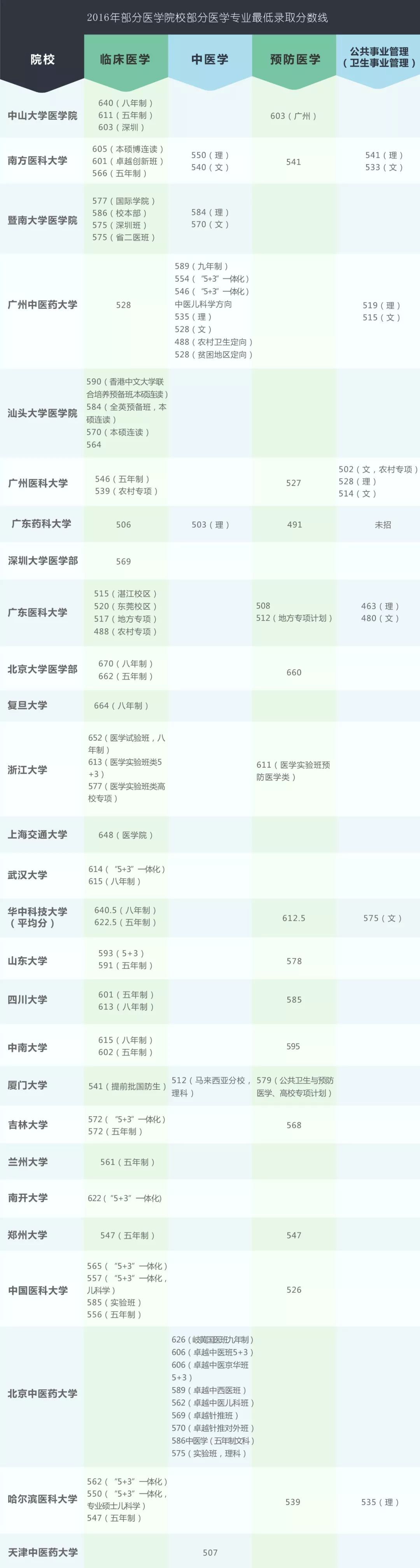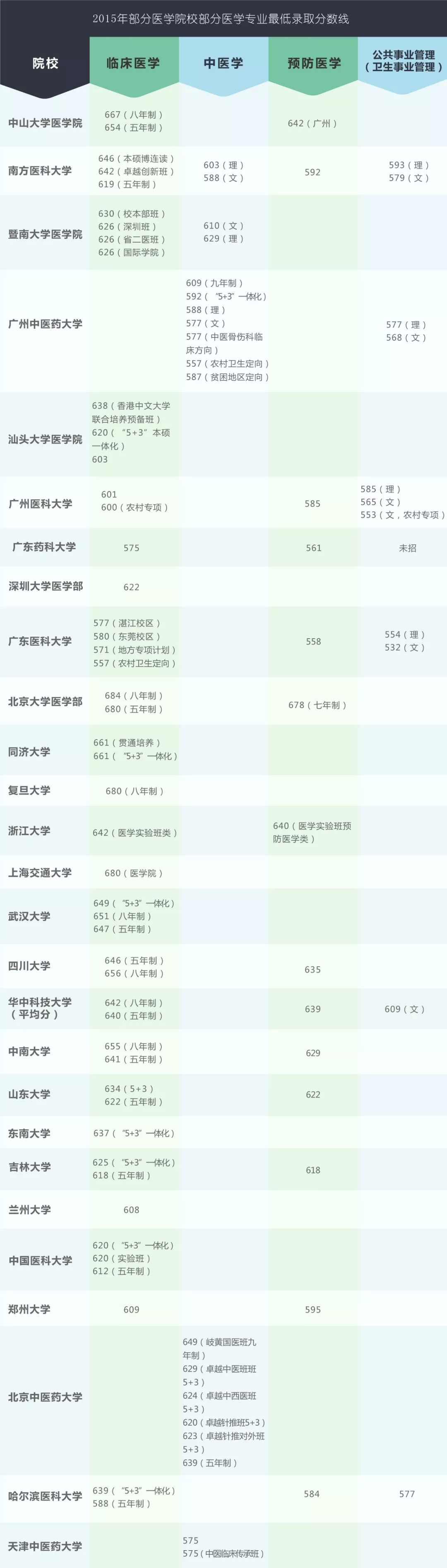 小编整理了2015~2017这三年,广东省内九所医学院校和全国部分知名大学医学部和知名医学院校招收临床医学、中医学、预防医学和公共事业管理(卫生事业管理)的最低录取分数线,供广大考生们参考,学校排名不分先后哦~