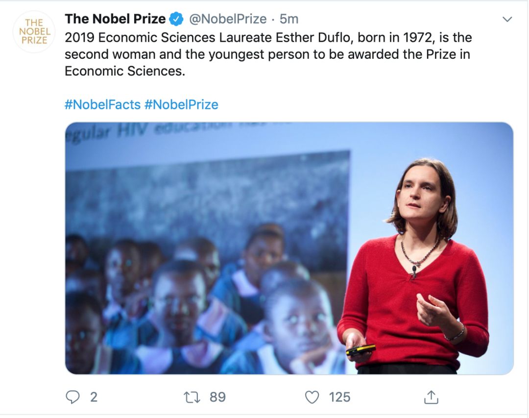 诺贝尔经济学奖公布,最年轻、第二位女性得主与丈夫同获奖