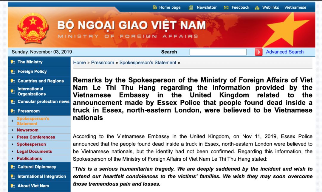 在英国警方表示遇难者为越南公民后,越南外交部于11月2日发布了一份声明,称“这是一场严重的人道主义悲剧”,“强烈谴责贩卖人口等犯罪行为”。