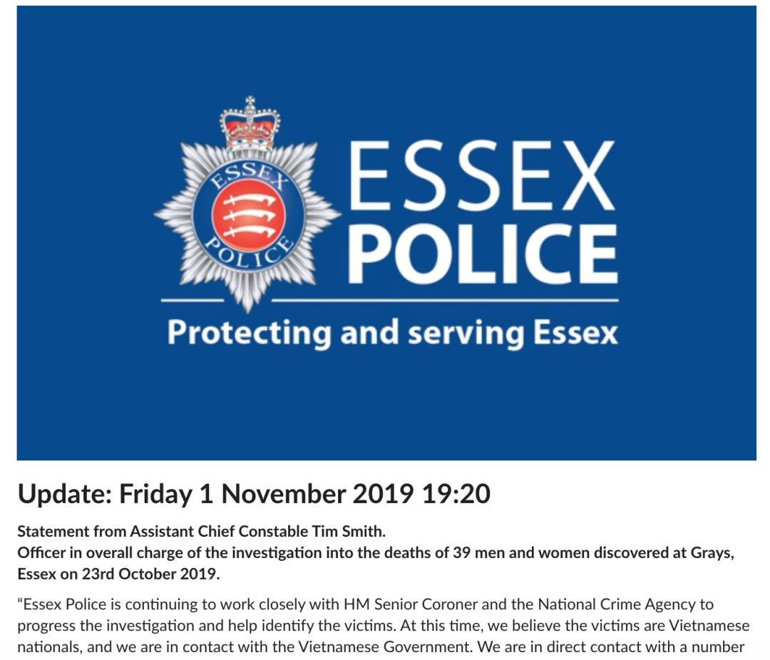 当地时间11月1日晚,埃塞克斯警方发布声明称39名遇难者为越南公民。/截图自埃塞克斯警局官网