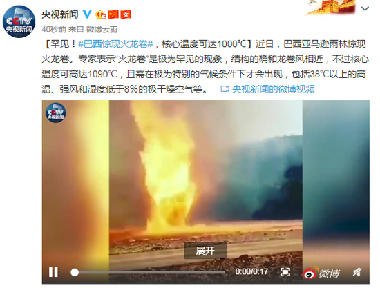 原标题:罕见!#巴西惊现火龙卷#,核心温度可达1000℃