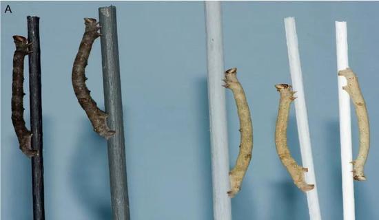 桦尺蠖在不同颜色杆子上的颜色变化 (图片来源:文献1)为了更像一根枝条,桦尺蠖除了会变颜色外,还会把腰板挺直,模拟一根分叉出来的树枝。