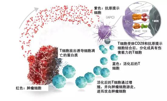 T细胞(T cell)是一种淋巴细胞,在骨髓中产生的前体细胞通过胸腺的选择而分化并成熟。T细胞占外周血淋巴细胞的70-80%。细胞表面的特征蛋白是T细胞受体(T细胞受体; TCR)。名字“T”来自Thymus,意思是胸腺。T细胞在免疫系统中扮演重要的角色,T细胞不仅防止感染,而且驱动自身免疫和过敏性疾病。如下图所示,T细胞在对抗恶性肿瘤细胞方面发挥重要的作用。卡普尔教授为理解T细胞关键的抗原特异性反应及相关分子如何参与免疫识别做出了重要贡献。例如,他们研究了带有表面抗原CD4的T细胞与一型糖尿病的关系。他们也研究T细胞受体与其靶向抗原在不同条件下的相互作用,目的是了解为什么自身免疫性疾病和过敏只发生在某些个体,并改进癌症疫苗。
