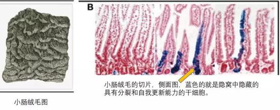 汉斯·克拉弗斯教授是第一位在肠道中鉴定干细胞的人,并且是世界领先的正常干细胞和干细胞研究者之一。克拉弗斯教授的团队一直从事肠道和肠道生理方面的最为基础的研究,在这个肠道领域中,有成千上万的研究胃癌,结肠炎或克罗恩氏病的胃肠病学家,但很少有实验室研究正常组织,而克拉弗斯教授却着眼于这些正常的组织。如下图,绒毛是小肠壁的手指状突起,为了吸收营养,小肠内的绒毛使得小肠具有最大化可利用的吸收表面积。每个绒毛的底部都被多个上皮细胞包围,这些凹陷的部位称之为隐窝。