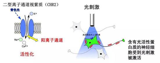 首先解释什么是光遗传学,利用遗传学(例如转基因动物杂交等)的手段,使得感光蛋白质(如绿藻中含有的视紫红质)在特定的细胞中表达,通过光刺激来调控细胞活动的技术。如下图所示,通道视紫质是光敏感蛋白中的离子通道,当用青色光刺激时,它就会在细胞膜上形成一个开口的离子通道,利用这个原理,利用转基因的手段,将这个蛋白插入到神经或者肌肉细胞中,利用光激活细胞。举个简单的例子,将这个ChR2导入大脑中和运动相关的细胞中,用光照射后,细胞被激活,就会诱导四肢的运动。在帕金森病的研究中,利用这个手段发现了和帕金森病相关的重要脑回路调控蛋白。