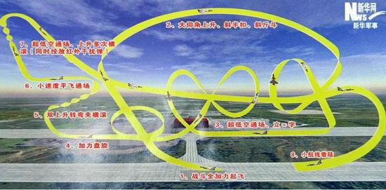 看完雨燕的分解动作,那么再理解下图这个歼十飞行表演的全套动作示意图。仔细观察,就可以发现这也是一个个动作单元串联成的。从这个图还可以发现,航展表演的整套动作,就在观众区域前方非常有限的空域里完成,对于飞机的低空低速操纵性和飞行员的操作有非常高的要求。
