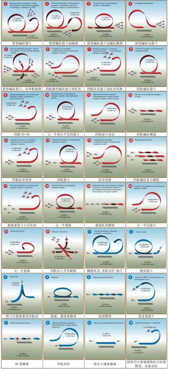 编队飞行表演由于飞机数量较多,机型也可以不限于同型机,各种队形变换带来了复杂的表演动作和更强的艺术表现力。下面是俄国网站给出的一套雨燕队的Mig-29飞行表演的动作分解,可以很清楚的了解到,一套飞行表演动作是如何由一个个单独的动作所串起来的。