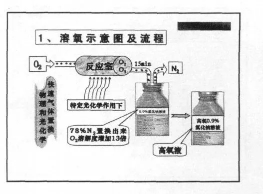 报道中提到的发明团队专家空军军医大学口腔医院麻醉科教授徐礼鲜在2011年第一届全国麻醉药理专业委员会第二次学术会议论文集的一篇论文《液体辅助供氧新方法》中介绍了高氧液的制备和特性。大概原理为在光化学作用下,将氯化钠溶液(生理盐水)中的氮气置换出来,得到含氧气0.9%的溶液。