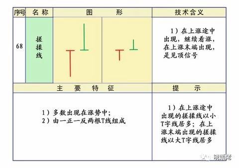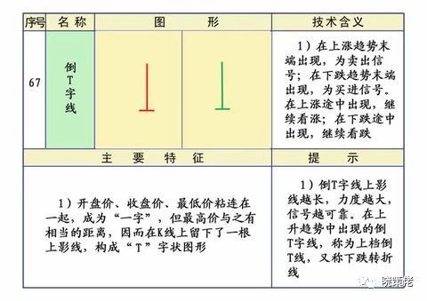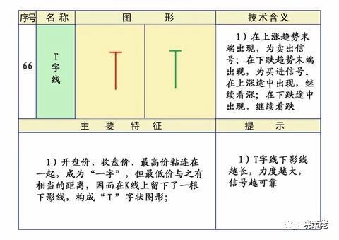 倒T.字线到底部,上影线长高八度。底部见到T.字线,庄家振荡把人骗。