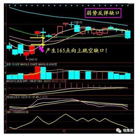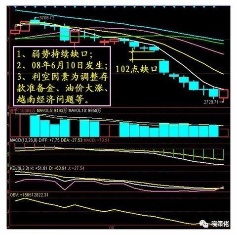 经验总结:如果有参与这波反弹行情者,最佳的止损位应设在大盘横盘初期,因为弱势横盘凶多吉少,加上量能持续萎缩,所以当时应以清仓操作为上策。另外KDJ、MACD都已死叉,OBV指标也已弯头向下等等,这些都是我们止损的理由和依据。另外,再一次止损机会是出现跳空缺口的时候,因这么大的跳空缺口,惯性一定是很大的!不能再抱有侥幸的心理了。(请看下图)