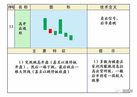 股价在高位,主力怎么才能顺利出货呢?对,他往往会采取拉高诱多的方式出货。所以高开出逃形往往是主力设置的“诱多陷阱”!高开出逃形可排在主力出货方式前三名的位置。其实“穿头破脚”也属于这种形态的原理。另外。顶部出现什么样的大阴线(特别是放大量的大阴线或带跳空缺口的大阴线),都是我们必须马上止损的最好理由(图形样式请看下面图二)!