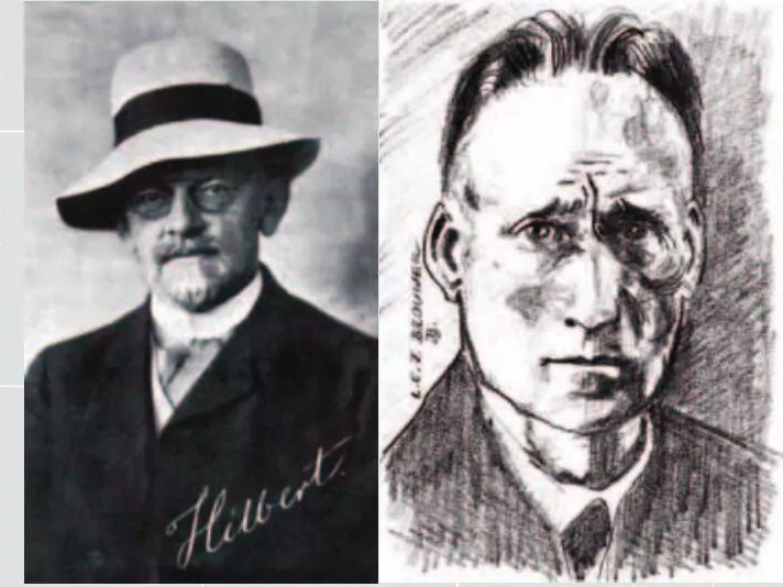 希尔伯特(1862~1943)是20世纪初最着名的德国数学家,他因为发明和发展了大量的思想观念(例如:不变量理论、公理化几何、希尔伯特空间)而被尊为伟大的数学家。布劳威尔(1881~1966)则是一位比希尔伯特小近20岁的荷兰数学家,在拓扑学领域有着突出贡献,他强调数学直觉,被视为直觉主义的创始人和代表人物。