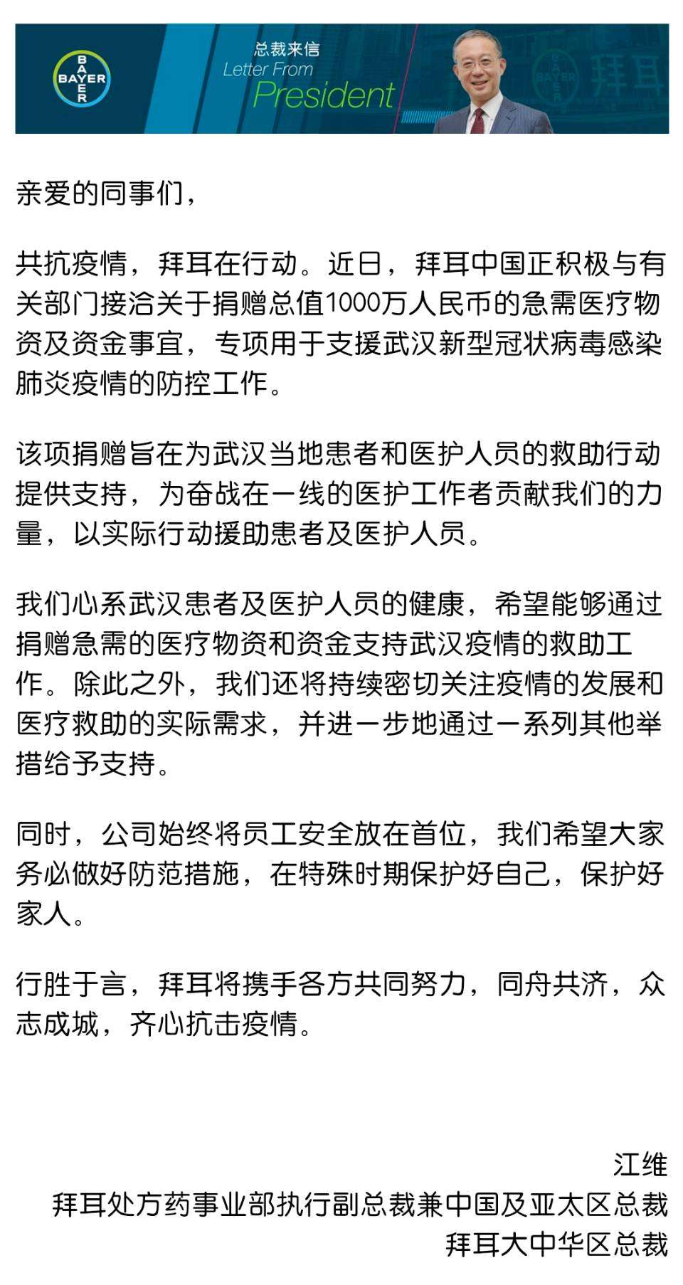拜耳处方药事业部执行副总裁兼中国及亚太区总裁,拜耳大中华区总裁江维表示:“我们心系武汉患者及医护人员的健康,希望能够通过捐赠急需的医疗物资用品和资金支持武汉疫情的救助工作。行胜于言,拜耳将携手各方共同努力,同舟共济,众志成城,共抗疫情。”