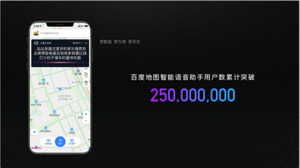 作为百度地图的智能化标杆,百度地图智能语音助手用户数目前已累计突破2.5亿。基于百度大脑领先的AI能力,百度地图提前布局5G时代,发力高精度定位、超精细渲染、免唤醒语音交互等多技术领域,面向未来打造更智能的城市交通体系,继续领跑5G时代的智能出行行业。