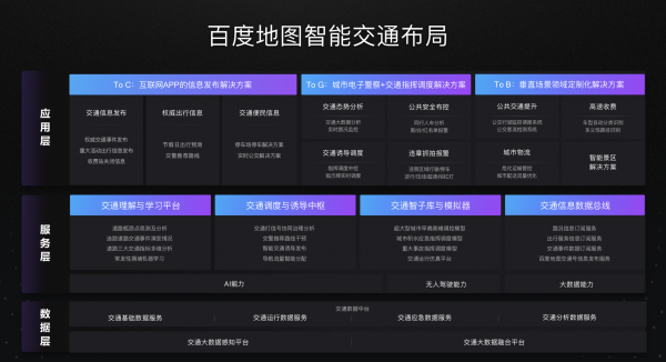 城市交通管理的焦点议题是“拥堵治理”,对此百度地图也给出了“化解之道”。百度地图已经形成了集交通大数据感知和融合能力为一体的交通数据中台,在此基础上以百度人工智能、无人驾驶、大数据为核心能力,提供算法模型、数据订阅、研判学习、指挥调度四大服务,最终形成了三大类应用方案,包括服务用户的权威信息发布解决方案,为政府部门提供城市交通管理指挥调度解决方案,以及面向合作伙伴的公交、高速、物流、景区等更加垂直的解决方案。