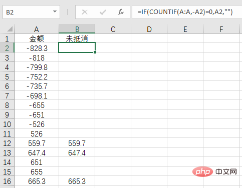 注意这里COUNTIF中的条件-A2,也就是找与A2可以互相抵消的数字,如果没有的话,通过IF得到A2,反之得到空值,使用了一个负号就巧妙的解决了一件麻烦事。