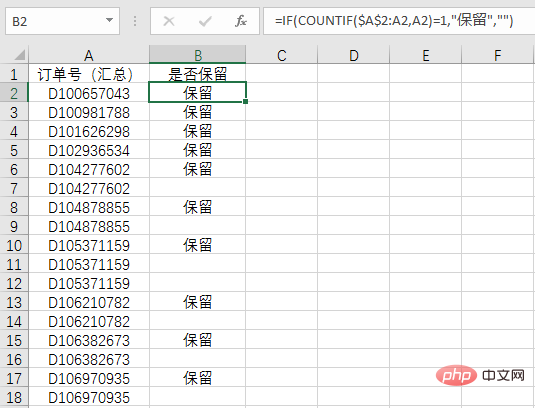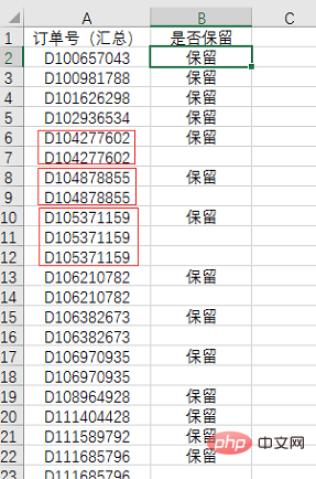 当找到重复订单后,第三个问题也就出来了,要在订单号后面标准是否保留的信息,如果有重复的则保留一个: