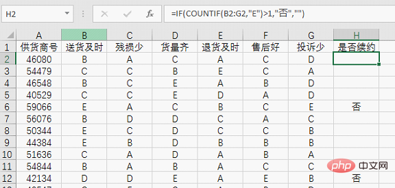 这一次COUNTIF的范围变成了行,在B2:G2这个范围内统计"E"出现的次数,同样注意要加引号,当统计结果大于1时,说明该供货商就有两项以上的差评(如果你非要用大于等于2,我也没意见),再使用IF得到最终结果。