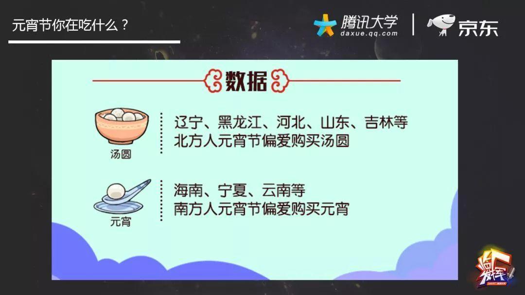 京东每年都会跟踪分析元宵节的消费数据。元宵与汤圆是两种不同的商品,一般而言,北方“滚”元宵、南方“包”汤圆,是我国不同地域的传统习俗。但2019年的消费数据显示,北方的消费者在正月十五更喜欢买汤圆,南方的消费者则开始喜欢买元宵,这其实反映了消费者「喜欢尝鲜」的消费心理。