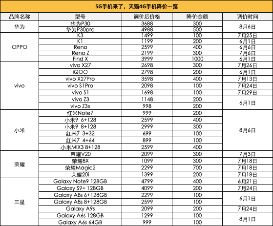 统计显示,近期天猫平台有超过30余款4G手机启动降价。8月6日,华为P30 Pro售价直降500元,小米9、vivo x27等热门机型紧跟步伐,下调100元至400元不等,在此之前,OPPO Find X 更是下调1000元,荣耀 Magic 2 下调700元,创下售价新低。