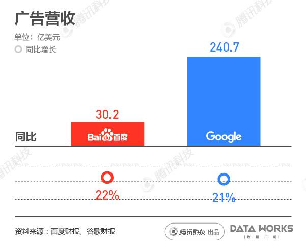从单价利润来说,百度是可以甩谷歌几条街,两家公司的搜索业务同样靠广告吃饭。从广告收入来看,百度达到30.2亿美元,而谷歌则是240.7亿美元,两者在总营收的占比都差不多,也就是85%左右。