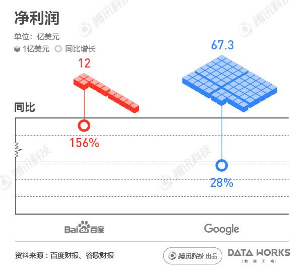 首先,从营业收入来看,百度同期营业额为35.3亿,而谷歌却达到了277.7亿,同样差不多七倍。