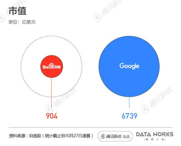 从市值上看,当百度达到904亿的时候,谷歌的母公司Alphabet(以下简称为谷歌)的市值都已经达到了6739亿,大概7倍多的样子,百度和世界巨头谷歌关于搜索方面的业务其实差距还是蛮大的。接下来我们再拆开细看。