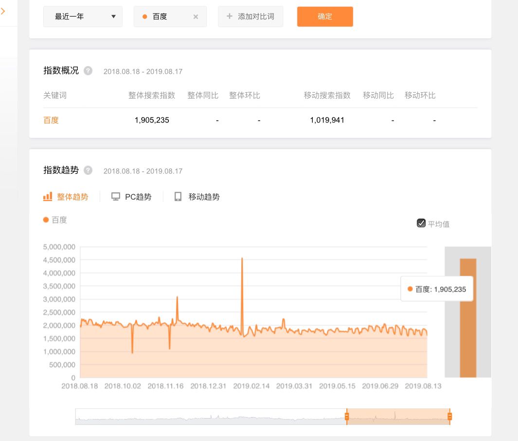 360搜索的情况同搜狗类似,360趋势显示,“百度”关键词最近一年内日均关注趋势达17078441次。