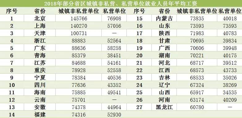 前段时间,全国有27个省份公布了2018年城镇非私营单位、私营单位就业人员年平均工资,其中北京、上海、天津的非私营单位年平均工资超10万元。非私营单位方面,超过全国平均水平82461元的有北京、上海、天津。