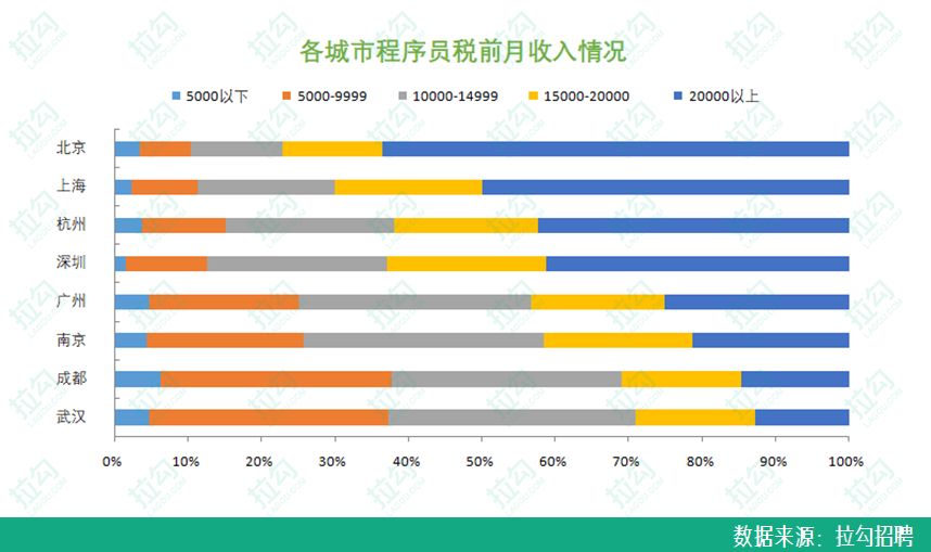 就薪资水平而言,北京遥遥领先,月薪20K以上占64%。上海紧跟其后,为50%。北京地区程序员薪资涨幅后劲十足(深蓝色代表月薪20K以上人群比例)。