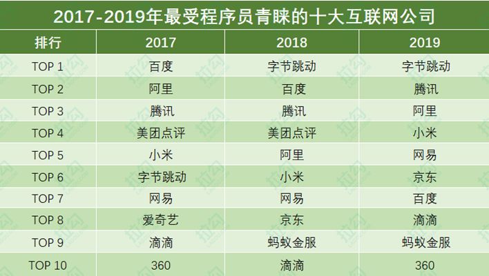 在2019上半年招收90后程序员最多的企业TOP榜中,字节跳动同样雄踞榜首,美团点评、腾讯、小米、商汤科技、网易、百度、快手、蚂蚁金服、滴滴紧跟其后。