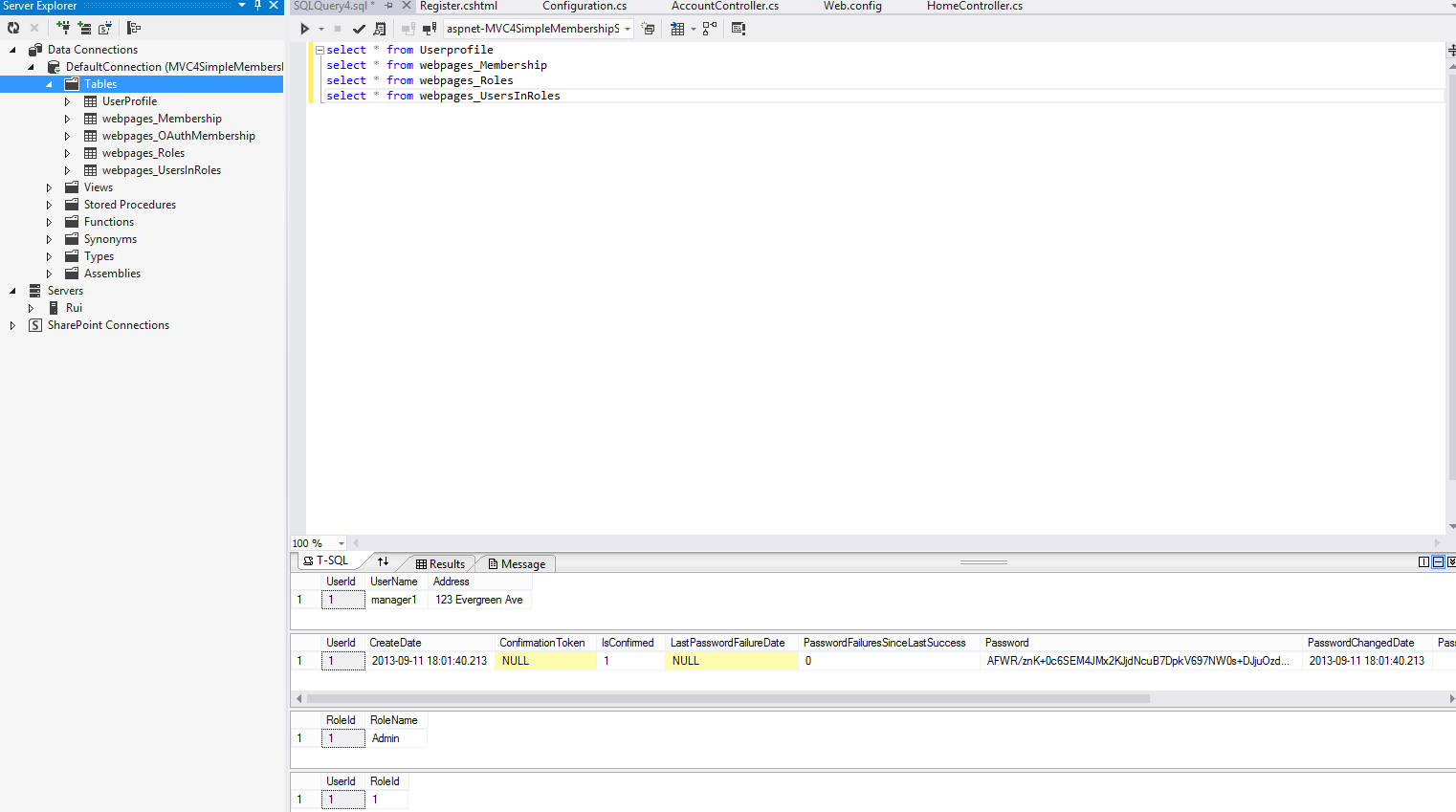 可以看到,我们之前在Code First中init的那个user和role已经在数据库中了。