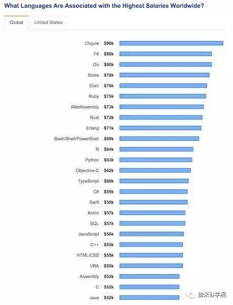 下图中是各类编程语言的开发者的年薪。可见,越是常用的开发语言,工资越低。