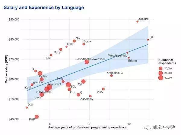 下图中,有一条蓝色的实线,在实线上面的语言,如Clojure、Scala、Go、Rust和R的开发人员,拥有越丰富的经验,就会获得更高的报酬。但是实线下方的语言,如PHP、VBA等,即使有多年的经验,工资也会更低。