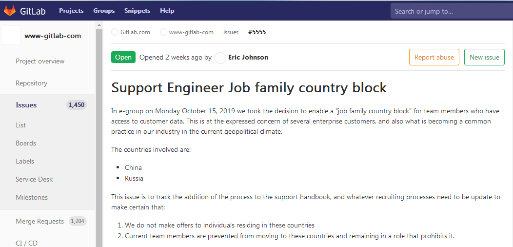 在GitLab.com的官方issue里,出现这样一条:我们决定对有权访问客户数据的团队成员启用“工作国家/地区封锁(job family country block)”,而封锁名单上只有两个国家——中国和俄罗斯。
