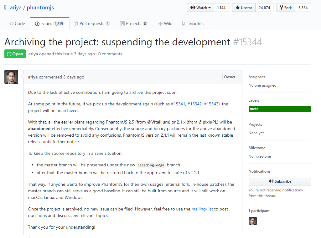 北京时间2018年3月4日1:16(时间上面就这么写吧……GitHub也没有标当地时间……),PhantomJS的作者ariya在PhantomJS的GitHub页面的issue #15344中写道: