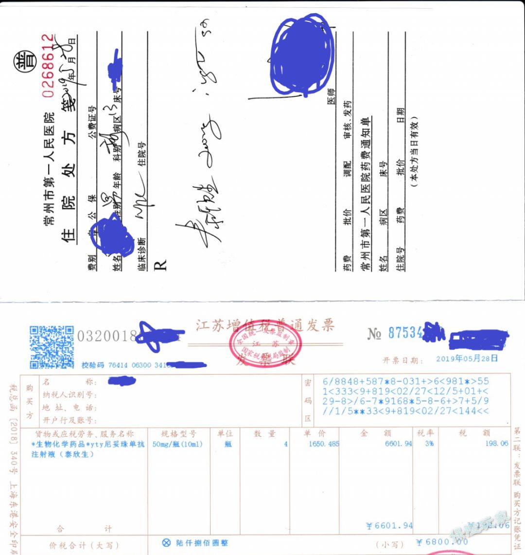 上图是当时的处方及购药发票,这款名为泰欣生的靶向药并不便宜,每次处方的剂量为4瓶,费用6800元,而同样的处方和发票一共有6张,总金额为40800元。