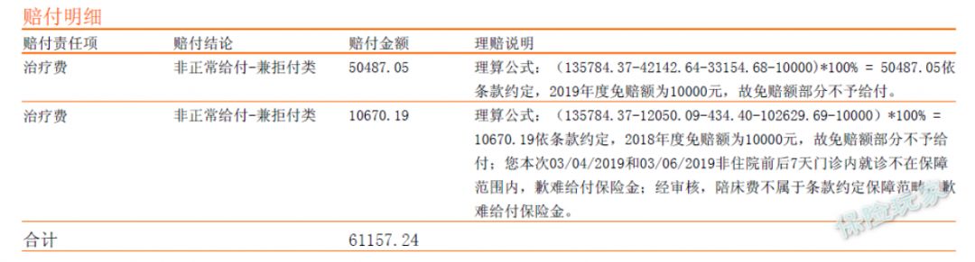 1万元的免赔额,目前几乎是这种中端百万医疗的标配,比如该案例中,e生保就有年度1万的免赔,而且正好治疗过程跨越了保单年度,所以理赔时,直接扣减了2万免赔额。